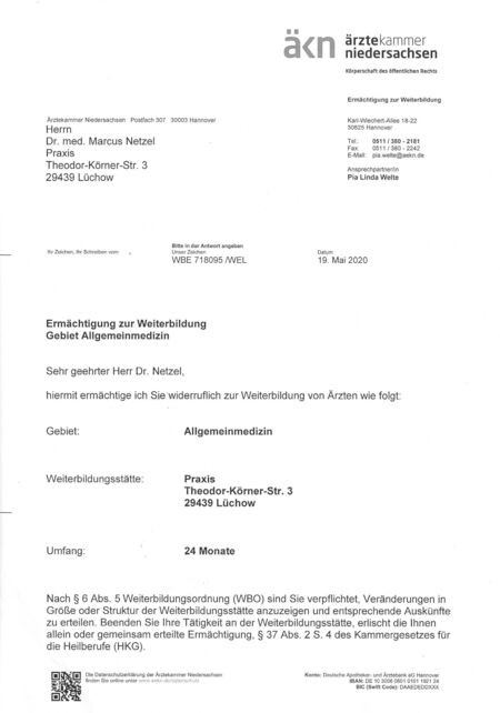 Unsere Praxis ist für eine Ausbildung zu diesem Zweck zugelassen worden.