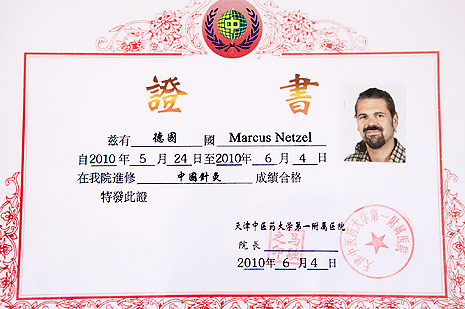 Studienaufenthalt an der Universität für Traditionelle Chinesische Medizin (TCM) in  Tjenjin, VR China. 2011 mit der Deutschen Ärztegesellschaft für Akupunktur (DÄGfA).